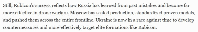 L’article indique que Rubicon coordonne de plus en plus étroitement ses forces de drones avec les unités d’assaut russes, en utilisant par exemple le drone Molniya (« Lightning ») pour attaquer les défenseurs ukrainiens en collaboration avec les unités d’assaut russes.