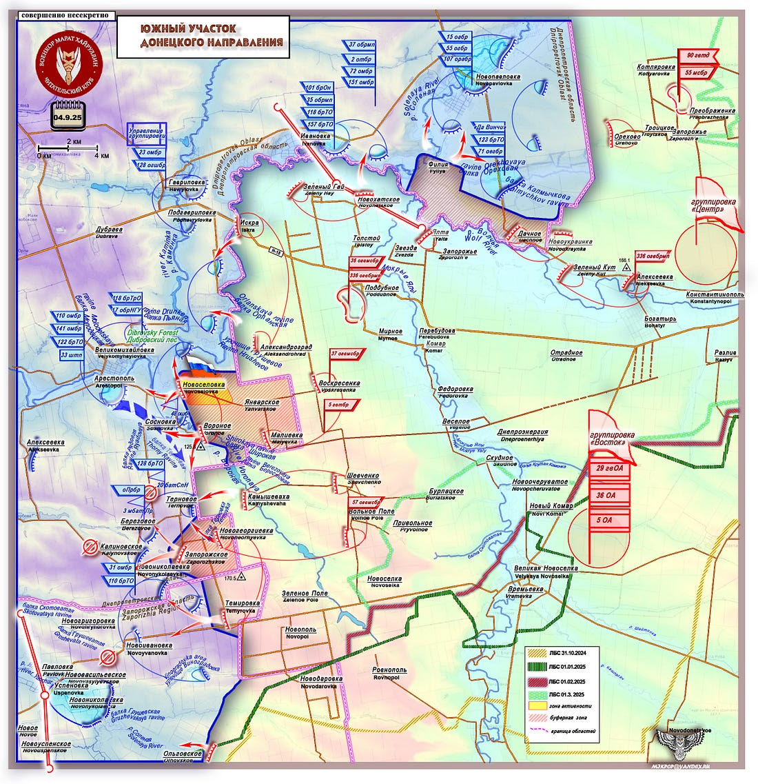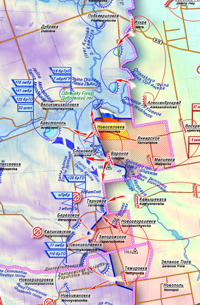 L’évolution la plus probable des événements dans ce secteur est la suivante : couvrir le flanc par des défenses dans le village de Novoselovka, le long de la route Novoselovka-Arestopol, sur le bassin versant des rivières Volchya et Voronaïa, afin d’atteindre le réseau de positions des forces armées ukrainiennes à Arestopol. Cela permettra de percer le système de nœuds défensifs le long de la ligne Velikomikhailovka-Ternovoe et de bloquer d’éventuelles contre-attaques ennemies depuis Arestopol-Ravin de Ternovaïa (Épineux)-Ternovoe, ainsi que les tentatives des FAU de débloquer la route Arestopol-Novonikolaevka.