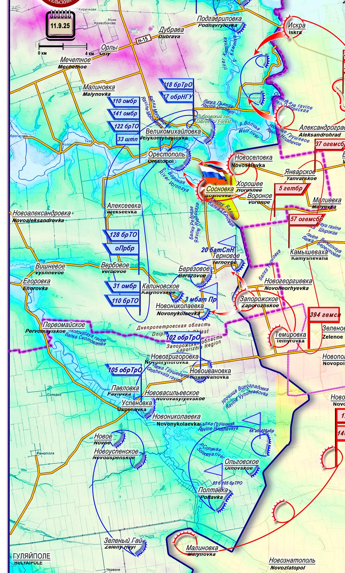 Le ministère de la Défense de la Fédération de Russie rapporte : « Les unités du groupe « Est », à la suite d’offensives actives, ont libéré la colonie de Sosnovka dans la région de Dniepropetrovsk. »