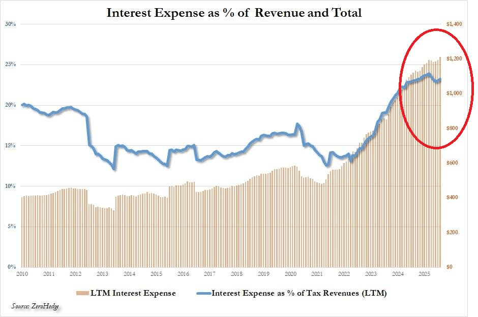 Le gouvernement américain a payé un montant record de 1,2 trillions de dollars d’intérêts sur sa dette publique au cours des 12 derniers mois. Cela représente près d’un quart des recettes du gouvernement. Pendant ce temps, la dette fédérale totale augmente d’environ 1 000 milliards de dollars tous les 100 jours.
