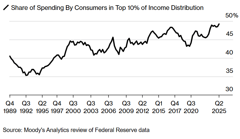 L’écart entre les familles ouvrières qui comptent chaque dollar et la vie confortable des classes moyennes supérieures et des personnes véritablement fortunées n’a jamais été aussi grand. Le Wall Street Journal cite un rapport de Moody’s Analytics indiquant que les 10 % des ménages les plus aisés représentent désormais une part plus importante que jamais des dépenses totales : 49,2 %, soit près de la moitié des dépenses totales, au deuxième trimestre 2025.