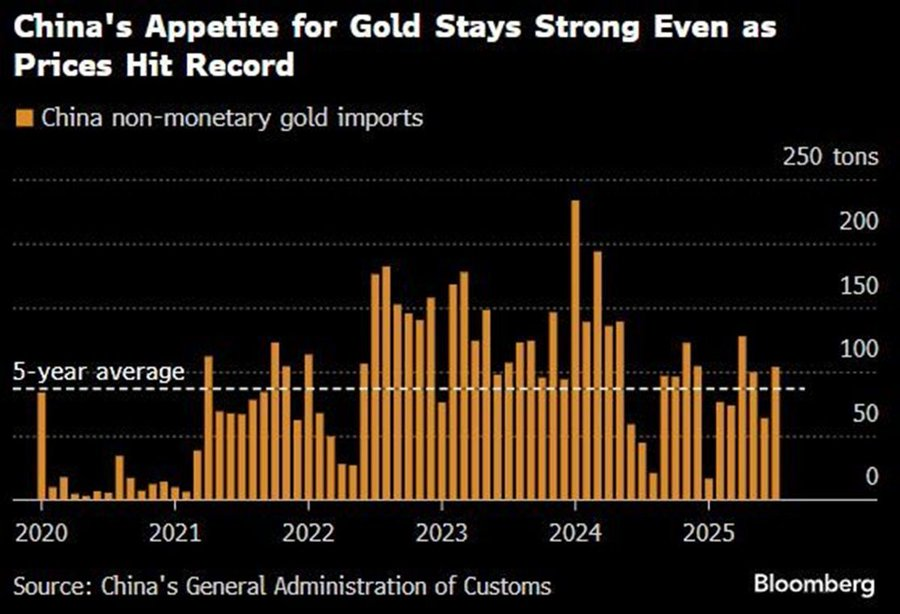 Luke Gromen souligne le point essentiel : si l’on cesse de considérer l’excédent commercial de la Chine uniquement en dollars et que l’on le mesure plutôt à l’aune des quantités d’or qu’elle importe, la situation change radicalement.