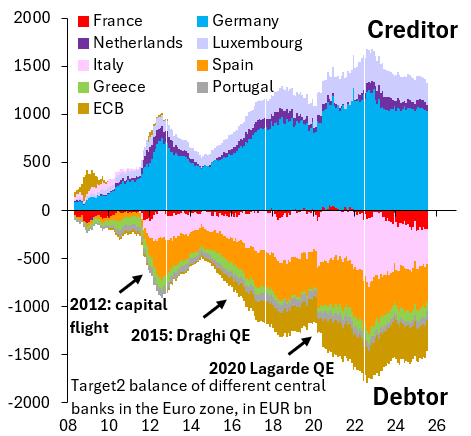 Le graphique ci-dessus montre les soldes mensuels de TARGET2 à partir de mai 2008, juste au moment où la crise financière mondiale se développait, le dernier point de données étant juillet 2025.