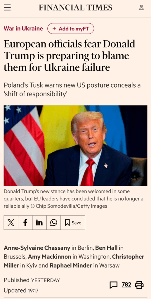 Mon interprétation du 24 septembre vient d’être adoptée par le Financial Times; Trump a refilé la responsabilité de la défaite en Ukraine aux Européens ainsi piégés.