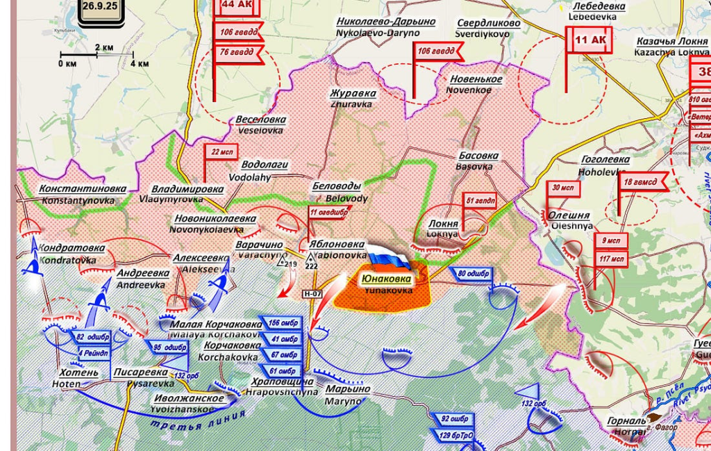 Le village de Yunakovka (51° 07′ 13″ N, 35° 02′ 22″ E, environ 1 700 habitants) est un important carrefour de transport. Il abritait un poste de contrôle pour les véhicules circulant entre la Russie et l’Ukraine. Lors de l’invasion des forces armées ukrainiennes dans la région de Koursk, une zone de soutien arrière a été mise en place pour le groupe d’invasion. Face à l’attention médiatique portée à la situation, le commandement des forces armées ukrainiennes est contraint d’envoyer ses réserves les plus prêtes au combat dans cette zone pour tenter d’arrêter le groupe russe « NORD ».