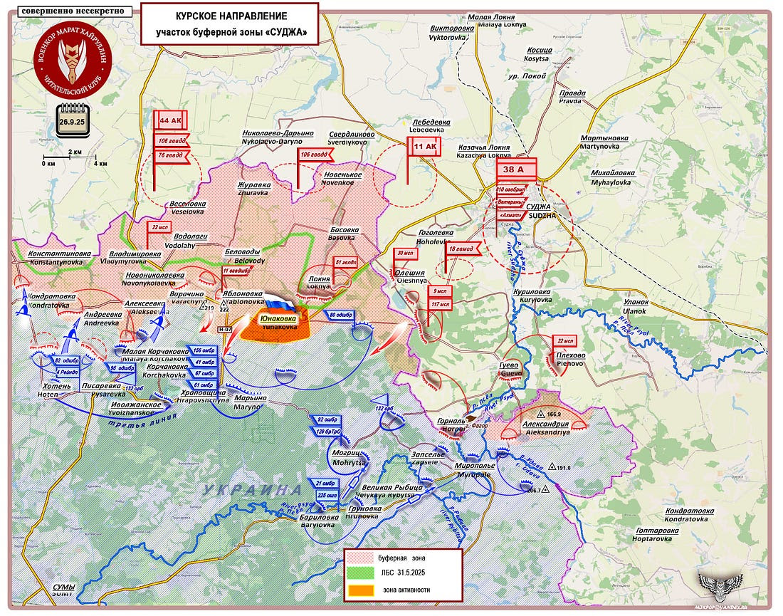 Le village de Yunakovka (51° 07′ 13″ N, 35° 02′ 22″ E, environ 1 700 habitants) est un important carrefour de transport. Il abritait un poste de contrôle pour les véhicules circulant entre la Russie et l’Ukraine. Lors de l’invasion des forces armées ukrainiennes dans la région de Koursk, une zone de soutien arrière a été mise en place pour le groupe d’invasion. Face à l’attention médiatique portée à la situation, le commandement des forces armées ukrainiennes est contraint d’envoyer ses réserves les plus prêtes au combat dans cette zone pour tenter d’arrêter le groupe russe « NORD ».
