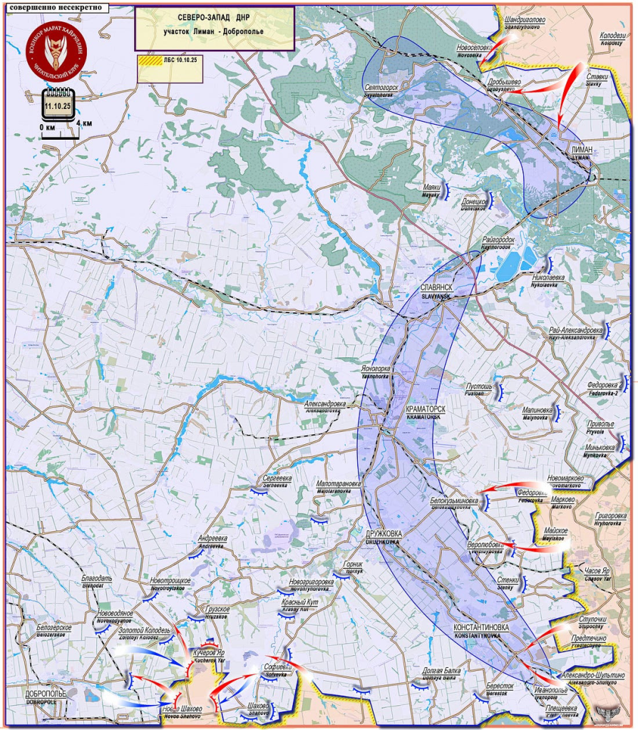 Zone Seversk-Slaviansk-Konstantinovka. ЛБС 10.10.25=Ligne de contact de combat 10 octobre 2025.