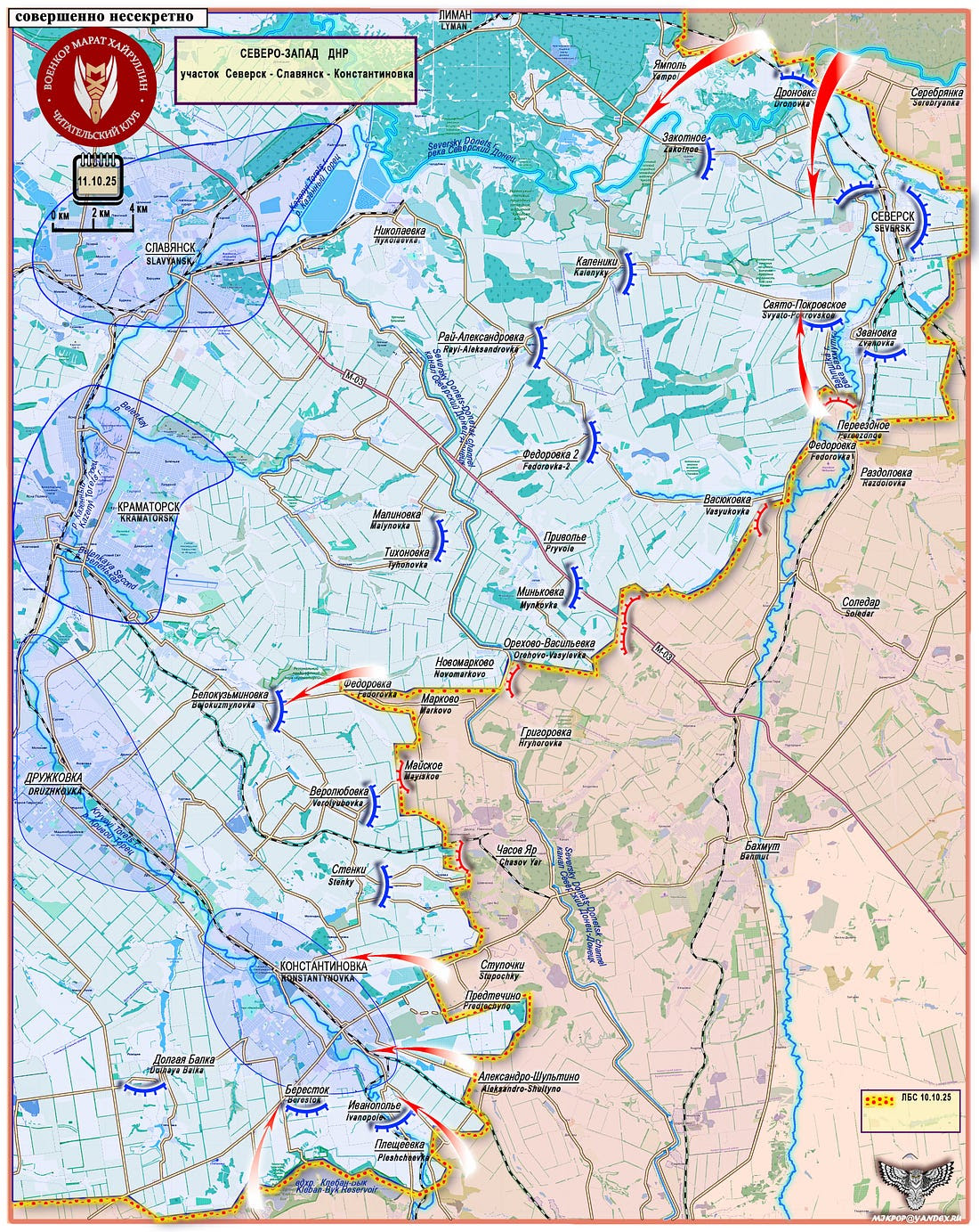 Zone Seversk-Slaviansk-Konstantinovka. ЛБС 10.10.25=Ligne de contact de combat 10 octobre 2025.