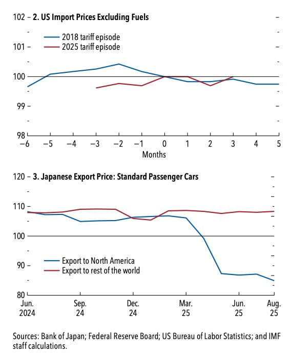 L’absence de baisse des prix à l’importation cette fois-ci – du moins jusqu’à présent – indique que les exportateurs dans leur ensemble n’ont pas absorbé les droits de douane par le biais de marges ou d’ajustements des prix à l’exportation, laissant les entreprises et les ménages américains en supporter le fardeau.