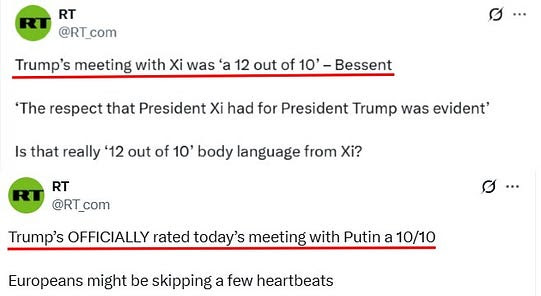 La réunion aurait duré moins de deux heures, et des rumeurs circulaient selon lesquelles les conférences de presse conjointes et autres cérémonies « officielles » auraient été annulées, comme ce fut le cas lors de la rencontre en Alaska avec Poutine. De fait, un Trump faussement enthousiaste a qualifié la réunion de « 12 sur 10 », reprenant ainsi la note de « 10/10 » qu’il avait attribuée quelques mois auparavant à la rencontre factice entre Poutine et l’Alaska.