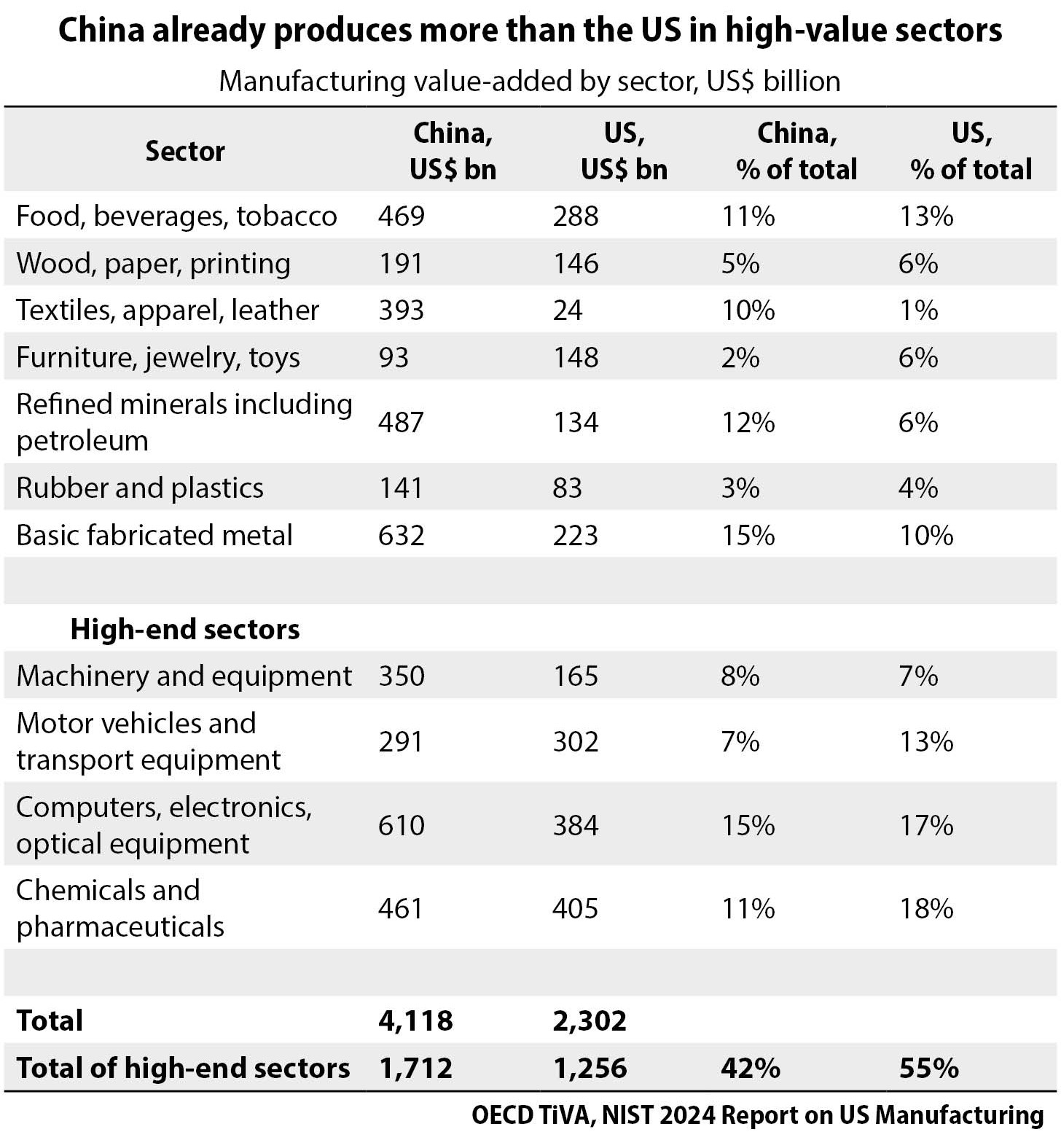 C’est une des principales raisons pour lesquelles comparer la valeur ajoutée manufacturière américaine totale, divisée par le nombre d’employés, avec celle de la Chine revient à comparer des pommes et des oranges. Les deux ensembles ne sont tout simplement pas comparables.