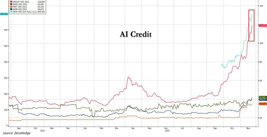 Dans une tendance similaire, CoreWeave, $CRWV , un fournisseur d’infrastructure d’IA, a vu son CDS à 5 ans grimper à 699 points de base, le plus haut niveau depuis le début des échanges cette année.