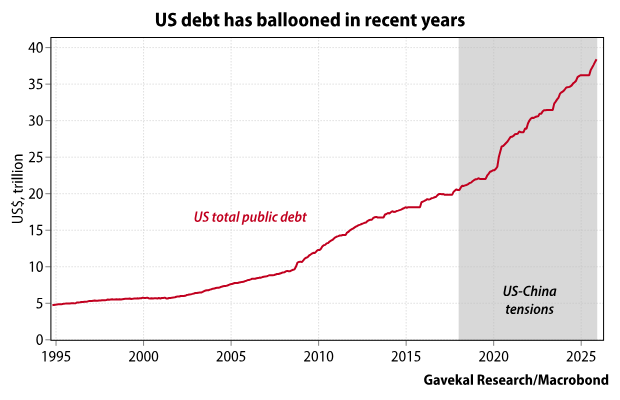 Pendant ce temps, les États-Unis n’ont absolument rien fait pour dé-siniser leur chaîne d’approvisionnement. Alors que la Chine se modernisait, les États-Unis se la coulaient douce. Et ils se sont donné à fond : le déficit budgétaire américain s’est creusé, mais a servi essentiellement à financer l’expansion des prestations sociales – sécurité sociale, Medicare et Medicaid. Entre 2018 et 2025, la dette publique américaine est passée de 21 000 milliards de dollars à 38 400 milliards de dollars. Pourtant, aucun des quelque 17 000 milliards de dollars d’augmentation de la dette n’a été investi dans la construction de nouveaux barrages Hoover, de nouvelles régies de la vallée du Tennessee, de nouvelles autoroutes inter-États ou de nouvelles voies ferrées.