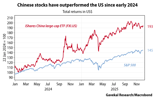 Cet embargo, bien que de facto, a marqué le début d’un affrontement de puissances . Dans les années qui ont suivi, la Chine est devenue « non rentable » et les États-Unis « exceptionnels ». Cette bifurcation des destins a constitué la principale tendance d’investissement entre 2018 et 2024. Ceux qui misaient sur les États-Unis et vendaient la Chine ont prospéré. C’était véritablement la seule stratégie gagnante.