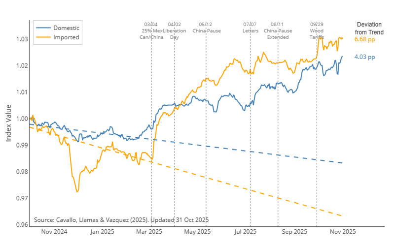 Harvard’s Pricing Lab data shows that goods prices – which were previously declining – have been on the rise since Trump started his trade war. Even domestic goods prices rose, though by a smaller amount.