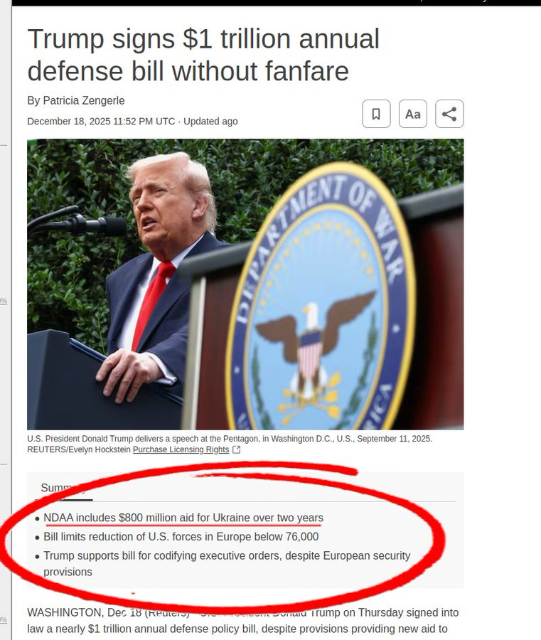 Trump signe un projet de loi de défense d’un trillion de dollars, dont 800 millions pour l’Ukraine