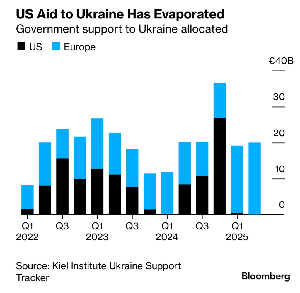 Le graphique met en évidence une réalité incontestable : l’UE est devenue le dernier recours financier de l’Ukraine face à la diminution des financements américains.