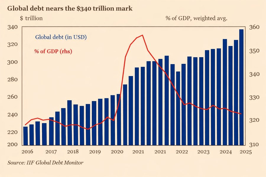 La mise à jour de l’IIF de décembre 2025 montre que la dette mondiale atteindra environ 346 trillions de dollars au cours des 9 premiers mois – les pressions de refinancement sont réelles et croissantes.