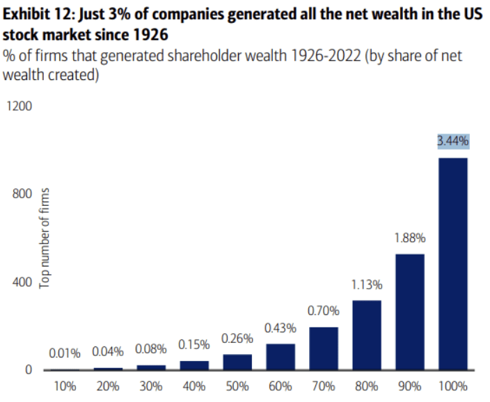 Etude de la Bank of America 3% des entreprises à elles seules ont généré toute la valeur, tout l’enrichissement procuré par la Bourse depuis 1926 et ceci s’est encore renforcé depuis la crise! Tout le reste est soit blanc , soi perdant!