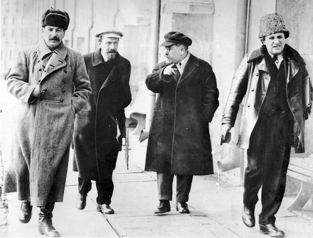 La direction soviétique en avril 1925. Sur la photo prise au Kremlin : Joseph Staline, secrétaire général du Parti communiste ; Alexeï Rykov, président du Conseil des commissaires du peuple (Premier ministre) ; Lev Kamenev, vice-président du Conseil des commissaires du peuple (vice-Premier ministre) . (Krasnay Niva, n° 17, 19 avril 1925. Magazine publié et dirigé par Anatoli Lounatcharski et Youri Steklov. Auteur : Nikolaï Petrov (1875-1940)/Wikipedia Commons)