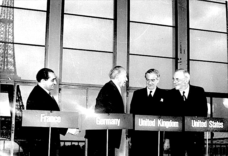 La Grande-Bretagne et la France, malgré leurs profondes inquiétudes historiques face à la puissance allemande, ont cédé aux pressions américaines. Lorsque le projet de Communauté européenne de défense – destiné à contrôler le réarmement allemand – s’est effondré, la solution adoptée fut d’autant plus lourde de conséquences : l’adhésion de l’Allemagne de l’Ouest à l’OTAN en 1955.