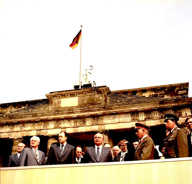 Le dirigeant soviétique Mikhaïl Gorbatchev à la porte de Brandebourg en 1986 lors d’une visite en Allemagne de l’Est. (Bundesarchiv, Wikimedia Commons, CC-BY-SA 3.0)