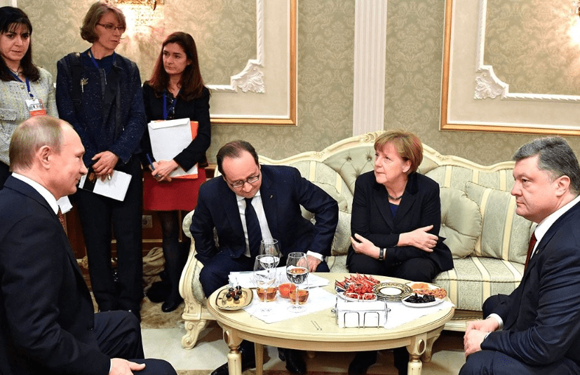 12 février 2015 : Le président russe Vladimir Poutine, le président français François Hollande, la chancelière allemande Angela Merkel et le président ukrainien Petro Porochenko participent à des pourparlers au format Normandie à Minsk, en Biélorussie. (Kremlin)