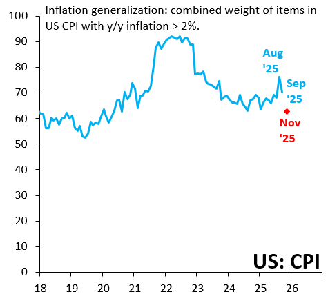 Une autre façon d’analyser la situation consiste à utiliser mes indices de généralisation de l’inflation, qui calculent le poids cumulé des éléments du CPI dont l’inflation annuelle est supérieure à 2 %. Le graphique ci-dessus présente les données de novembre 2025 par rapport aux données précédentes. Est-il possible que la généralisation de l’inflation ait chuté brutalement en novembre 2025 à son niveau le plus bas depuis août 2020 ? Oui. Mais est-ce vraiment probable ? Non.