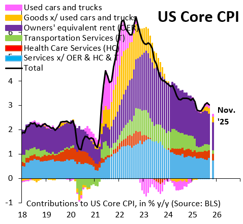 Le graphique ci-dessus illustre la contribution à l’inflation sous-jacente (CPI) annuelle (ligne noire) de janvier 2018 à novembre 2025. Les barres bleues mesurent la contribution de ce que j’appelle l’inflation des « services de base » , c’est-à-dire l’inflation des services hors loyers équivalents des propriétaires (barres violettes), services de santé (barres rouges) et transports (barres vertes). Il s’agit de ce que je considère comme l’inflation sous-jacente, car elle élimine une grande partie des fluctuations et met ainsi en évidence la tendance de l’inflation à moyen terme.