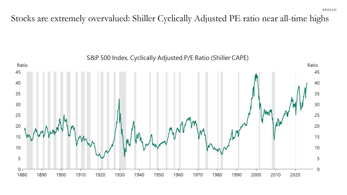 | Le ratio cours/bénéfice ajusté du cycle économique, également appelé ratio de Shiller, est un indicateur de valorisation boursière qui divise le cours actuel de l’action par la moyenne des bénéfices corrigés de l’inflation des dix dernières années. Ce ratio lisse la volatilité liée au cycle économique afin d’évaluer la surévaluation ou la sous-évaluation à long terme et de prévoir les rendements futurs. Il offre une meilleure mesure de la capacité bénéficiaire durable que le ratio cours/bénéfice traditionnel, qui ne prend en compte que les bénéfices d’une seule année. Les dernières données montrent que les valorisations boursières sont proches de leurs plus hauts niveaux depuis 1880 (voir graphique ci-dessous). Bien entendu ce ratio ne veut plus rien dire! En effet il relie les cours de bourse à des données économiques comme les bénéfices de la sphère productive normalisés, or depuis le désencrage des monnaies tous les efforts des banques centrales et des gouvernements visent à faire en sorte que les marchés boursiers échappent à la pesanteur de l’économie réelle pour ne traduire que les objectifs des politiques monétaires. Les marches sont des espaces de transmission des volontés et desirs des régulateurs. La situation objective concrète est celle d’un échange de titres boursiers, -donc quasi monnaie-, contre de la monnaie; si vous avez désancré la monnaie vous vous êtes donné la possibilité de désancrer les actifs boursiers! La libération des monnaies implique la possibilité de libération des actifs boursiers a l’égard de la pesanteur économique; les actifs boursiers libères et disjoints ne sont plus que soumis aux forces suivantes: -pression de la masse de liquidités -taux d’intérêt -volatilité , risque -appétit pour le jeu -mimetismeL -peur et paniques |