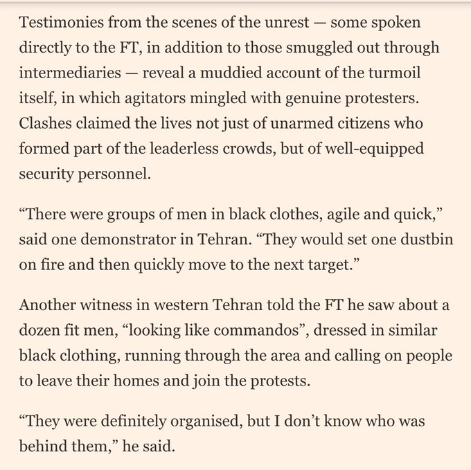 Le Financial Times est l’un des premiers médias occidentaux à reconnaître l’existence de cellules bien organisées semant la terreur dans les villes iraniennes : « Il y avait des groupes d’hommes vêtus de noir, agiles et rapides. Ils mettaient le feu à une poubelle puis passaient rapidement à la cible suivante. » Ils « ressemblaient à des commandos ». « Ils étaient manifestement organisés, mais je ne sais pas qui les commandait. »