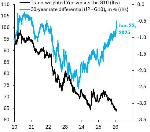 - La prime de risque budgétaire du Japon n’a jamais été aussi élevée : comme le montre le graphique ci-dessous, l’ écart entre le différentiel de taux à 30 ans du Japon (en bleu) et le yen pondéré par les échanges commerciaux par rapport aux devises du G10 (en noir) est sans précédent. Une hausse de ce différentiel devrait attirer des capitaux au Japon et renforcer le yen. Or, ce n’est pas le cas. Cela signifie que les taux d’intérêt, notamment à long terme, n’ont pas pu augmenter suffisamment pour compenser le mépris du Premier ministre Takaichi pour l’austérité budgétaire. Le Japon doit sortir de son déni concernant sa dette. Une nouvelle dépréciation du yen sera nécessaire pour y parvenir.