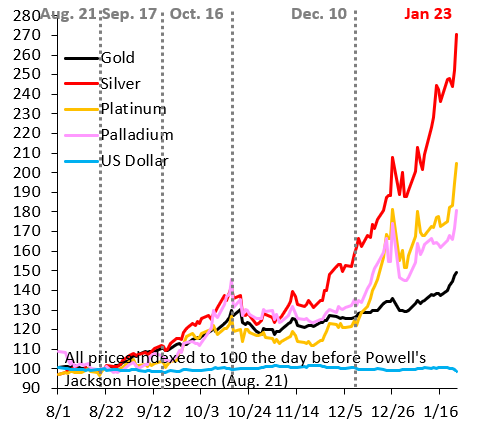 - Les métaux précieux s’envolent : la conjugaison de risques géopolitiques accrus et de l’effondrement du marché obligataire japonais a propulsé leurs cours à une hausse spectaculaire. L’argent affiche désormais une progression impressionnante de 170 % depuis Jackson Hole le 22 août, comme le montre la courbe rouge du graphique ci-dessous. Le platine a progressé de 105 % (courbe orange), tandis que l’or a gagné 50 % (courbe noire). Outre la faiblesse du dollar, ma principale prédiction pour 2026 était que le marché de la dépréciation monétaire serait florissant. Force est de constater que c’est bien le cas.