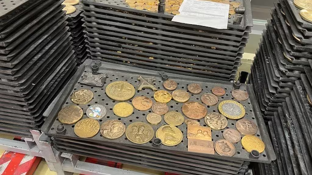 Armé d’un marteau et d’un burin, Corentin passe « des heures et des heures sur un seul sujet ». Lui est graveur de monnaie, un métier en voie de disparition, qui va de la création du dessin sur la pièce à la réalisation de la matrice. « C’est un moule, mais à la place de faire couler de la matière comme dans un moule, on va frapper de la matière », détaille-t-il.