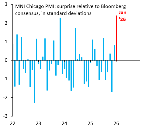 Il n’est pas évident que cette hausse soit liée à la nomination de Warsh, car – comme le montre le graphique ci-dessus – l’indice PMI de Chicago affichait un très bon résultat à 9 h 45 (une surprise positive de 2,4 écarts-types par rapport au consensus Bloomberg).