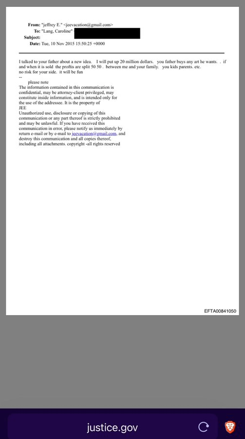 Epstein à Caroline Lang, 2015 : « J’ai parlé à ton père d’une nouvelle idée. Je mettrai 20 millions de dollars, ton père achètera n’importe quelle œuvre d’art qu’il veut. Si et quand elle est vendue, les profits seront partagés 50/50. Entre moi et ta famille : toi, les enfants,Voir plus