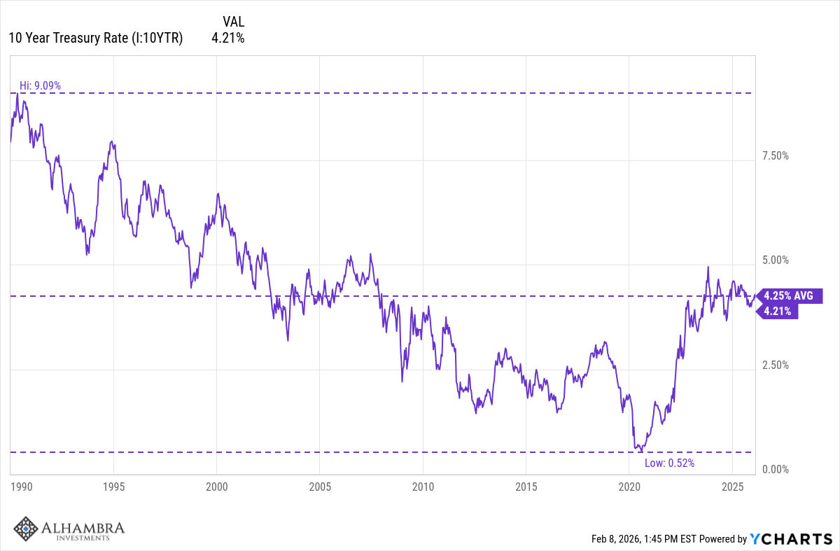 Le taux des obligations du Trésor à 10 ans a augmenté de 2,7 points de base au cours du dernier mois et se situe tout près de sa moyenne à long terme. Circulez, il n’y a rien à voir.
