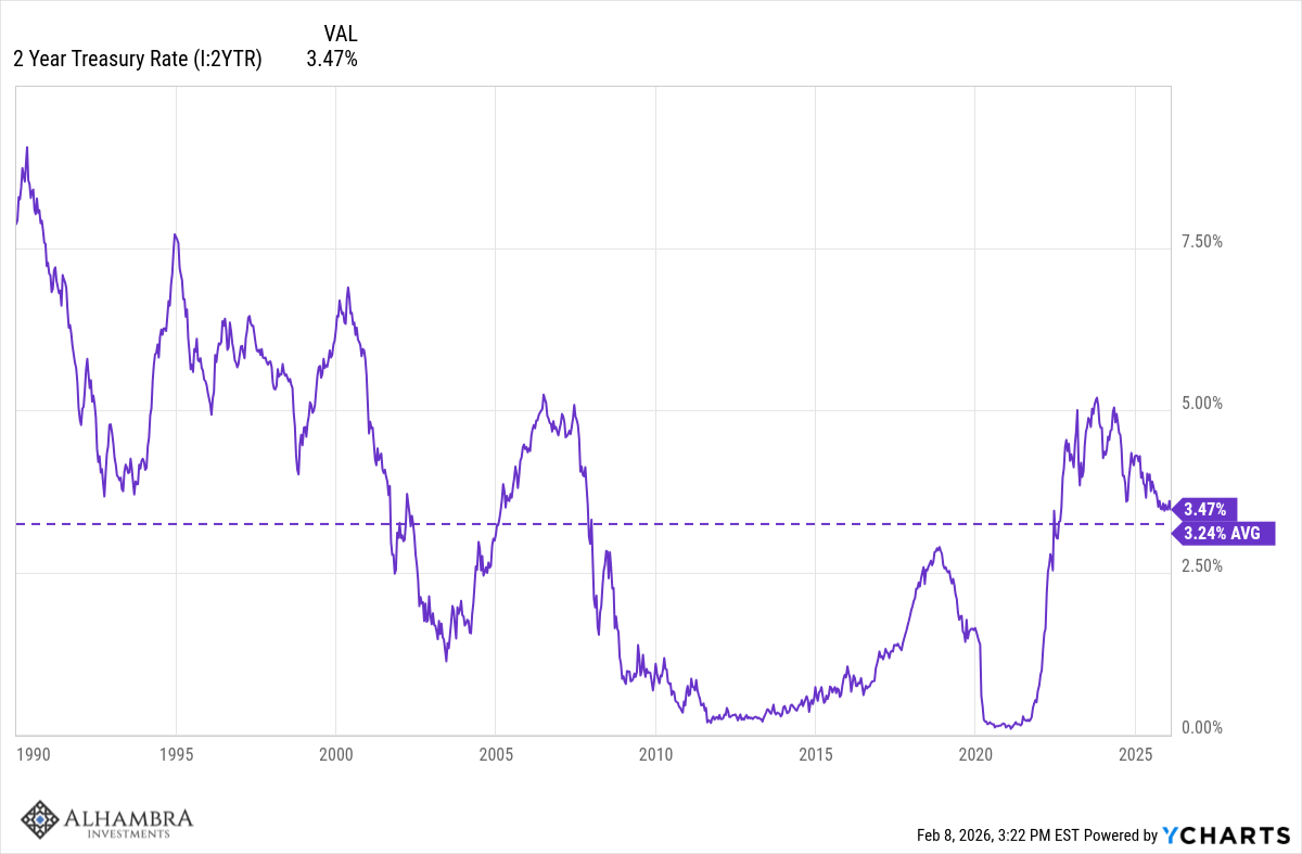 Le taux des obligations du Trésor à 2 ans est resté inchangé au cours du dernier mois et se situe également autour de sa moyenne à long terme.
