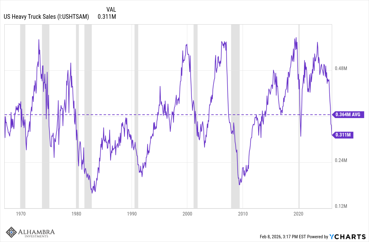 - Les ventes de poids lourds ont chuté de 30 % en décembre par rapport à l’année précédente ; un indicateur fiable de récession qui se situe désormais bien en dessous de la moyenne à long terme