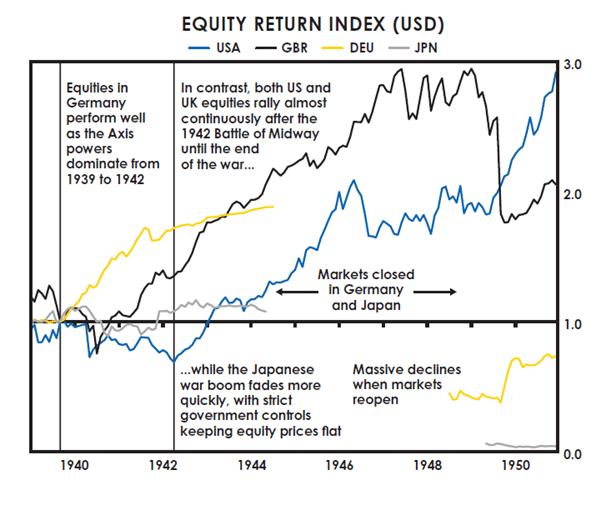Les défaites militaires entraînant généralement la destruction totale des richesses et de la puissance, les fluctuations des marchés boursiers restés ouverts pendant la guerre étaient largement tributaires des résultats des batailles clés, ces résultats influençant la probabilité de victoire ou de défaite de chaque camp. Par exemple, les actions allemandes ont surperformé au début de la Seconde Guerre mondiale, l’Allemagne conquérant des territoires et établissant sa suprématie militaire, avant de sous-performer après que les Alliés, comme les États-Unis et le Royaume-Uni, eurent renversé le cours de la guerre. Après la bataille de Midway en 1942, les actions alliées ont progressé de manière quasi continue jusqu’à la fin du conflit, tandis que celles de l’Axe sont restées stables ou ont baissé. Comme illustré, les marchés boursiers allemand et japonais, fermés à la fin de la guerre, n’ont rouvert que cinq ans plus tard et étaient quasiment anéantis à leur réouverture, tandis que les actions américaines affichaient une excellente performance.