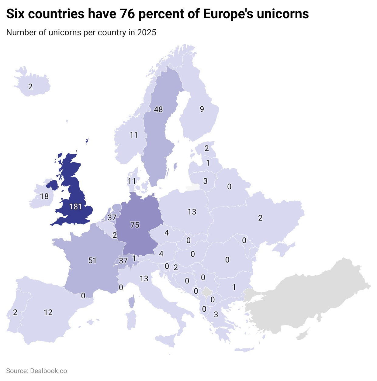 En Europe, la Suède occupe la quatrième place en termes absolus, derrière le Royaume-Uni, l’Allemagne et la France, pays dont la population est cinq à huit fois supérieure. Le PIB de l’Italie est plus de quatre fois supérieur à celui de la Suède, pourtant elle ne compte qu’un tiers des licornes, soit le même ratio que l’Espagne, dont la population est cinq fois plus importante et le PIB deux fois supérieur.