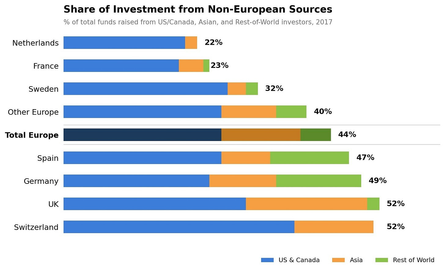 D’après les données de Dealroom, compilées par Bradley et ses coauteurs , 44 % des capitaux-risqueurs investis dans les entreprises européennes proviennent de l’extérieur de l’Europe. Cette dépendance transfrontalière est particulièrement marquée sur certains marchés nationaux : en 2016, l’Autriche, l’Irlande, la Suède et l’Espagne ont chacune reçu plus de 70 % de leurs investissements en capital-risque de la part d’investisseurs étrangers.