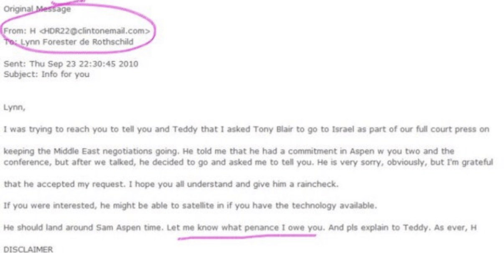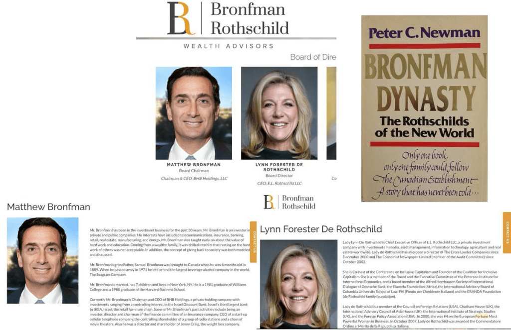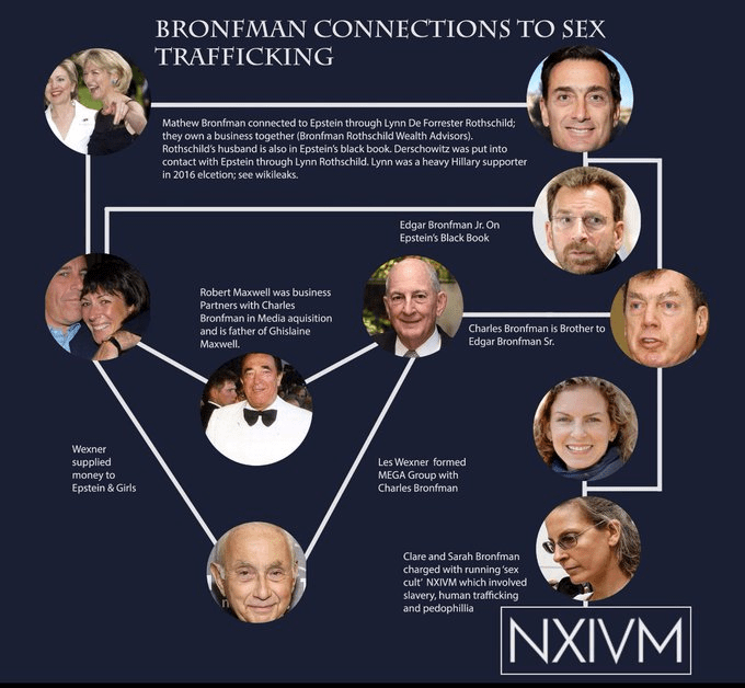Lynn de Rothschild est également membre du conseil d’administration de Bronfman EL Rothschild LP. Sara et Clare Bronfman étaient des figures importantes de la secte NXIVM de Keith Raniere, qui comptait parmi ses membres de grands donateurs d’Hillary Clinton. Robert Maxwell était associé à Charles Bronfman, qui a fondé le groupe MEGA avec Lees Wexner.
