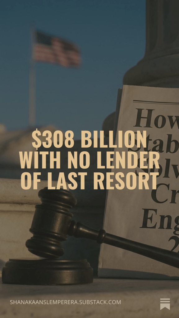 La Réserve fédérale a l’interdiction légale de garantir quoi que ce soit de cette opération. Article 4 (a)(8). C’est voulu. Le marché anticipe ce problème pour 2028. La Fed n’a déjà pas respecté le délai légal pour définir les mesures d’intervention en cas de crise. La date limite pour l’élaboration des règles est juillet 2026. La plupart des règles n’ont pas encore été proposées. La fenêtre de vulnérabilité n’est pas 2028. Elle est maintenant.
