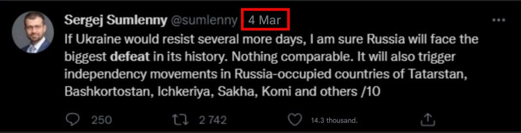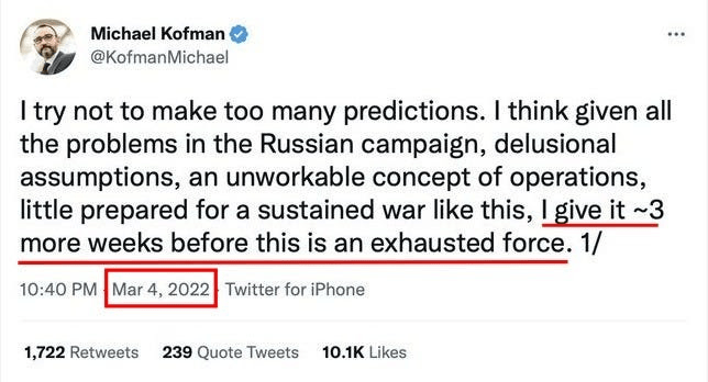 Rappelons, par exemple, les prophéties de l’un des « analystes » militaires les plus vénérés d’Occident dès le début de la guerre :