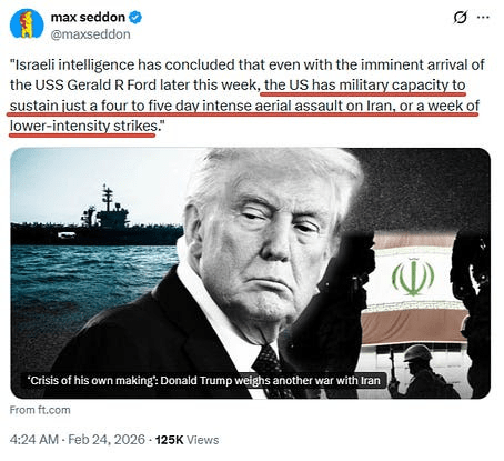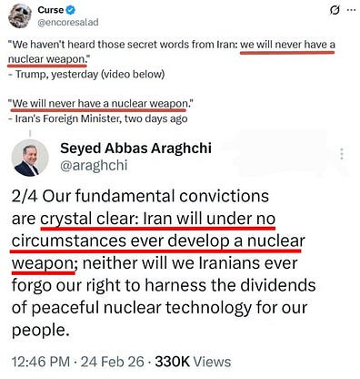Pendant ce temps, Trump et sa bande de clowns continuent de se discréditer par des messages totalement contradictoires. Par exemple, lors du cirque médiatique qu’a été le discours sur l’état de l’Union hier soir, Trump a affirmé qu’il suffisait à l’Iran de « prononcer les mots magiques » pour que des frappes imminentes soient évitées, en promettant de ne pas se doter de l’arme nucléaire. (Source : NYT )