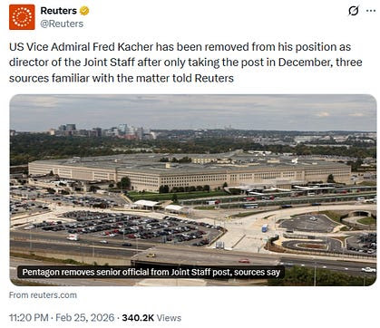 WASHINGTON, 25 février (Reuters) – Le vice-amiral américain Fred Kacher a été démis de ses fonctions de directeur de l’état-major interarmées après avoir pris ses fonctions en décembre seulement , ont indiqué mercredi à Reuters trois sources proches du dossier.