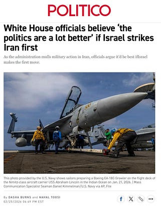 On en est arrivé au point où des responsables américains envisagent désormais de laisser Israël prendre l’initiative afin de rendre la guerre contre l’Iran aussi politiquement « acceptable » que possible :