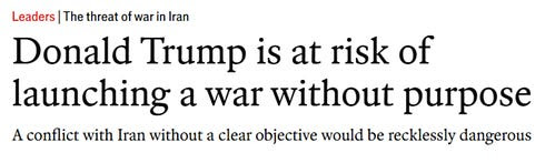 De plus, certains appels à la non-intervention, présentés comme de faux héros, ne sont pas ce qu’ils paraissent être : il s’agit plutôt de tentatives détournées visant à « influencer » Trump afin qu’il présente la guerre de manière plus crédible et permette ainsi aux plans barbares d’Israël de se dérouler sans accroc. Par exemple, le premier article de The Economist, intitulé « Trump risque de déclencher une guerre sans but », se veut une sorte d’apologie de la paix, jusqu’à ce qu’on lise entre les lignes et qu’on comprenne qu’il s’agit simplement d’inciter Trump à trouver un argumentaire convaincant pour l’opinion publique américaine avant de passer à l’acte.
