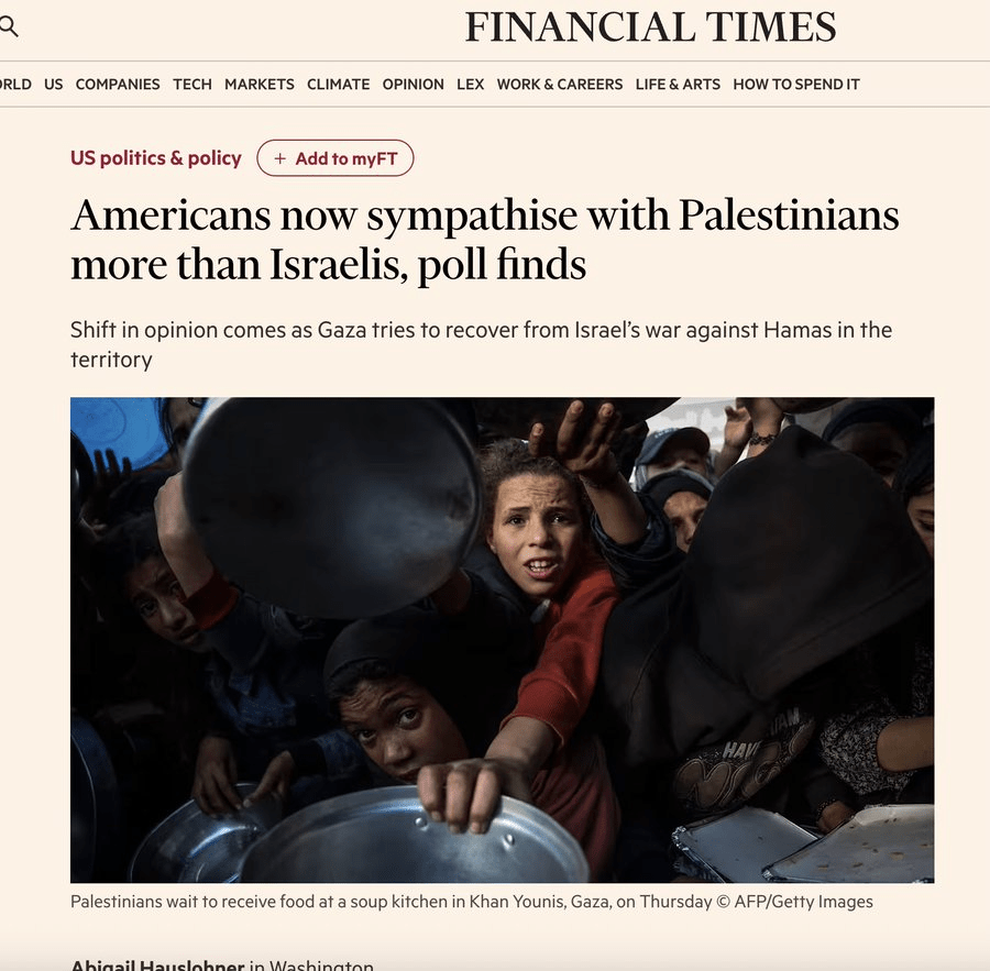 NOUVEAU : Pour la première fois dans l’histoire des sondages Gallup, une majorité relative d’Américains sympathise davantage avec les Palestiniens qu’avec les Israéliens. L’importance de ce changement est capitale. Et contrairement à ce que l’on pourrait croire, il ne se limite en aucun cas à la gauche.